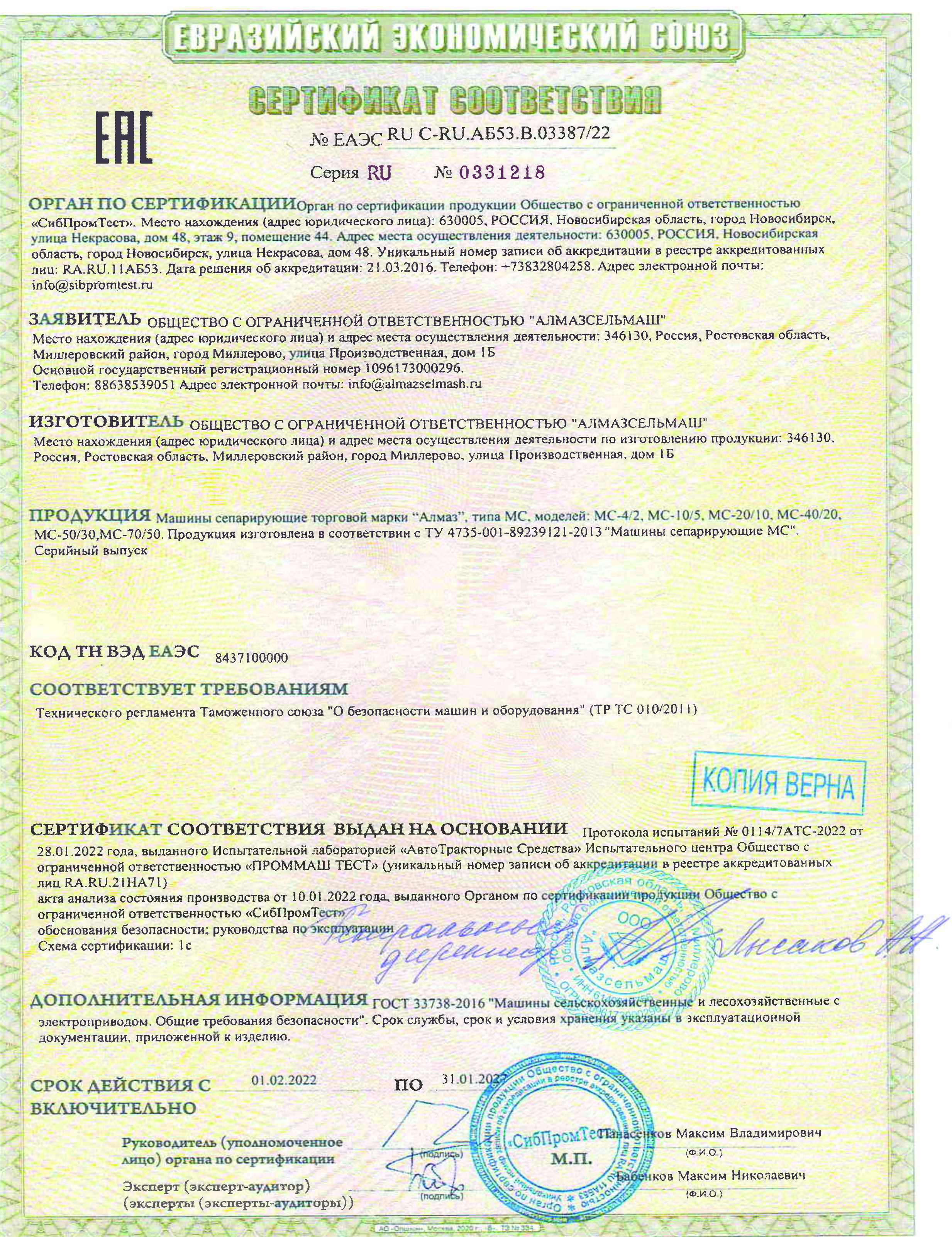 Сепарирующая машина АЛМАЗ одновременно с очисткой зерна производит сушку зерна воздушным потоком за один проход до 2 % |